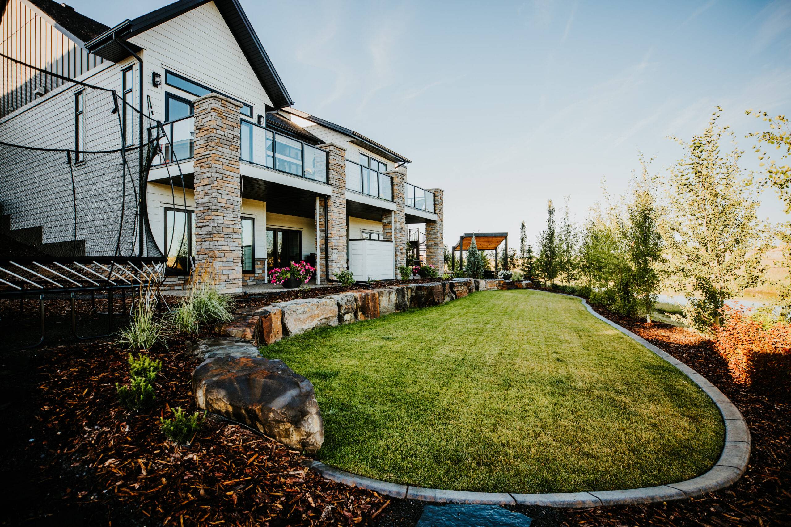This project started with a full design consultation and a complete landscape design that was required for community approvals. The first step after approval was adjusting the grade to manage the steep changes from front to back. To manage this, we added a natural stone retaining wall in the backyard and natural stone steps down each of the sides of the home. This allowed our client to have a fully functional landscape while keeping the refined look.
